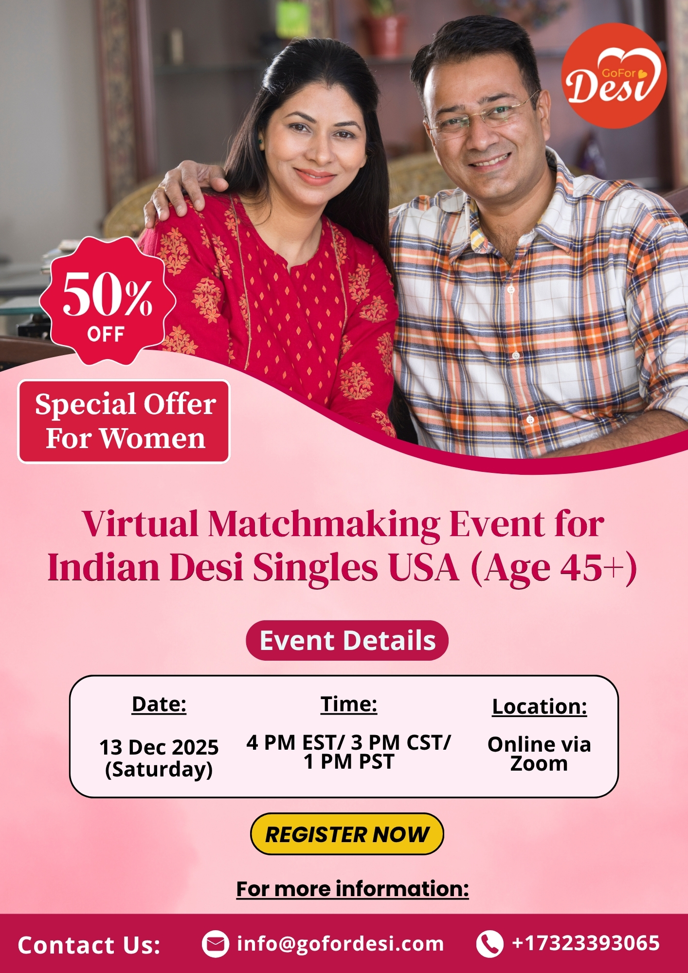 Looking to meet Indian singles in the USA for meaningful connections? Join GoForDesi.com’s Virtual Speed Dating Event for Indian Desi Singles (Ages 45+) — a perfect opportunity to meet Indian men and women across the United States in a safe, private, and efficient online setting.